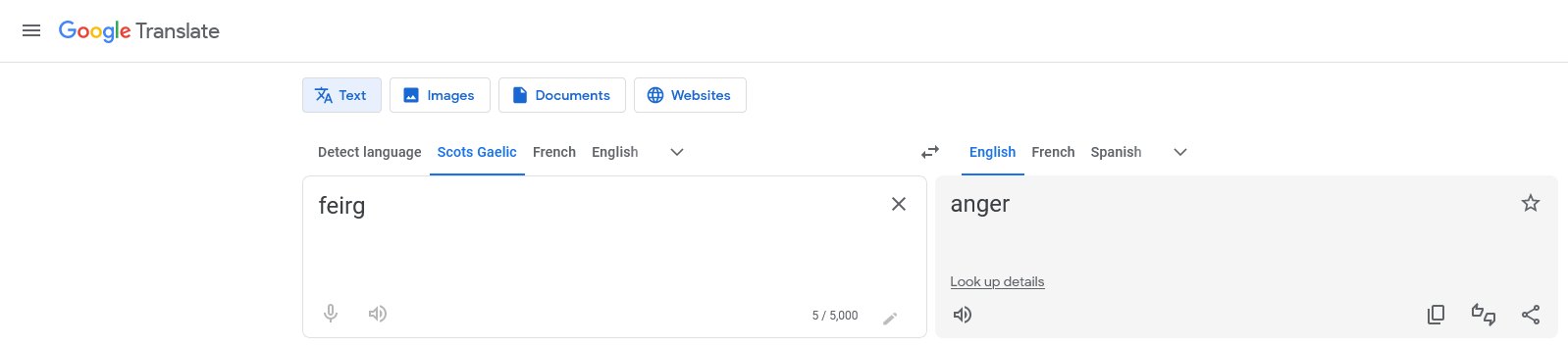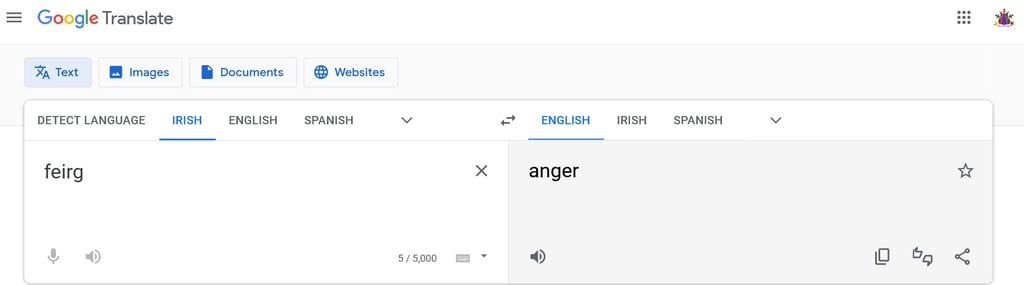 Google Translates "Feirg™" from Scots Gaelic to "Anger" in English